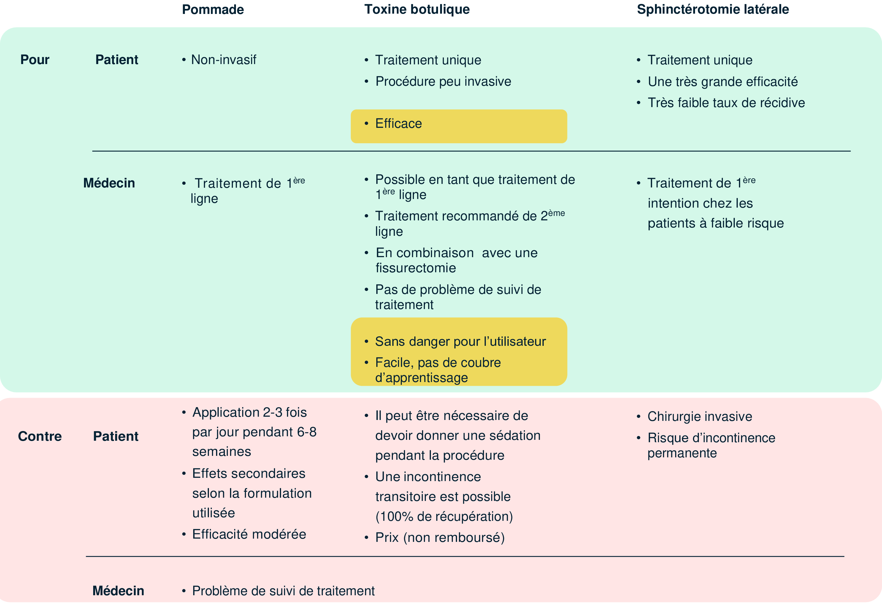 Avantages et inconvénients des traitements les plus fréquemment utilisés pour la fissure anale